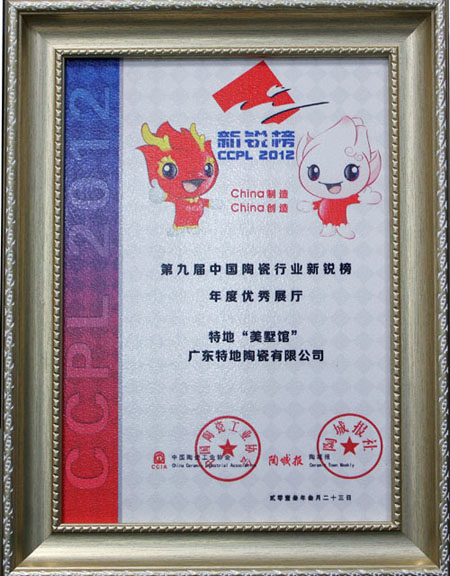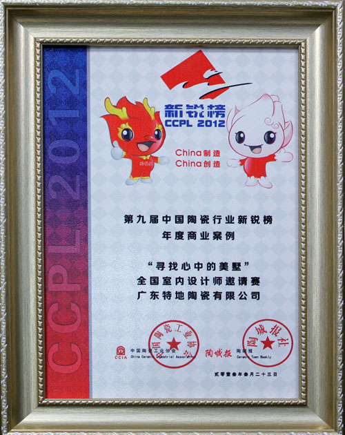 荣获“年度优秀展厅”的特地总部“美墅馆”近4000平方米,历时近1年打造而成,以底蕴深厚的东方文明和摩登时尚的西方文化精髓融为一体,赢得了评委的一致好评;2012 特地陶瓷全新力作“玉麒麟”获得本届“年度优秀产品”,玉麒麟灵感源于天然石材“麒麟玉”、“彩虹玉”,为了保留天然石材丰富的纹理变化和玉石晶莹、温润、细腻的自然特征,特地研发人员通过无数次试验,独创“立体悬浮触控”和“辊筒打印”技术,吸取了天然石材人文与自然的精华,将生动的麒麟纹理融入产品,主料玉质晶体含量高达60%,其整体呈出玉石般温润、雅致的气质,极致的通透性足以让同类抛光砖黯然失色。”;2012年特地“寻找心中的美墅”全国室内设计师邀请赛获得本届“年度商业案例”,大赛历时4个月,受到了全国各地各大家装品牌与设计界精英的广泛关注,1000多名设计师共展出近2000套作品,首次采用网络平台展出,以选秀的模式真正凸显“心中的美墅”在不同层次群体的共鸣。
