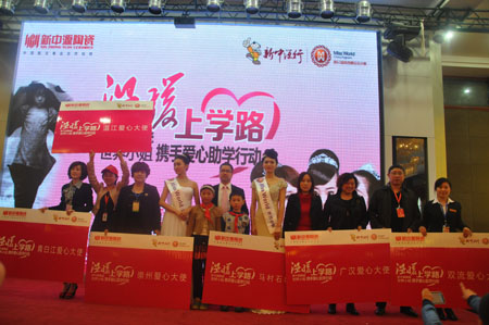 活动现场进行了“温暖上学路”物资捐赠仪式,世界小姐中国赛区佳丽及业主代表向马村乡石堰小学师生赠送了此次筹集的物资及新中源为师生购买的大量必需品:每人一双球鞋、一套校服、铅笔盒、尺子、圆规等物资共十余种。接受捐赠的学校老师激动地说:“感谢各位爱心业主、新中源及世界小姐对学校的关心与帮助,帮助我们解决了学生迫切的问题。”