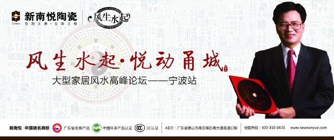 历经2012年的筹备酝酿,2013年新南悦陶瓷“风生水起,大师之旅”主题活动即将拉开帷幕。“风生水起,大师之旅”是新南悦陶瓷旨在为中国消费者传递新东方文化内涵,和权威风水学理论的主题活动。新南悦陶瓷为其宁波首站重金邀请了著名风水大师宋韶光亲临现场,讲述传统风水学理论与现代家居设计之道,为消费者带来更多家居装修摆设的专业指引。