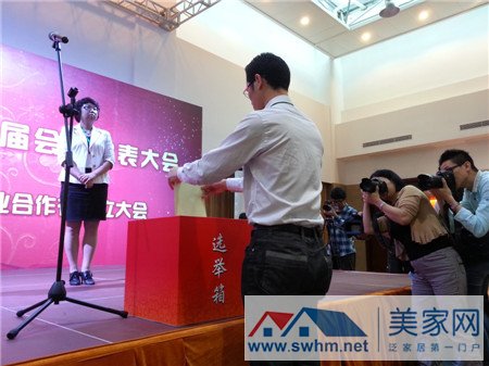 在吴焕亮副会长做选举办法说明好,参会的协会内企业单位等对选举第三届理事会做投票选举。与会代表现场填写选票,而后投进放置在舞台前端的投票箱内,由工作人员在监事会单位代表的监督下统一清点。