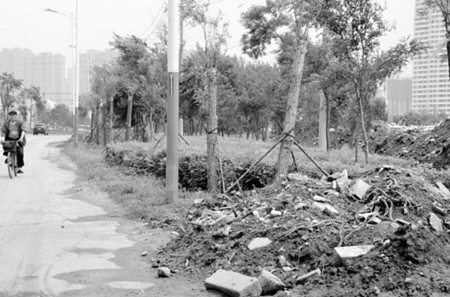中午,记者从三好桥南岸驶入滨堤路,放眼望去,风景如画的滨堤路每隔几十米就有一堆像小山似的建筑垃圾,将路边的树木包围住。“这片绿化带因被垃圾覆盖,小草和野花以及一些灌木都被压死了。”一名环卫工人说,她感到非常心疼。她告诉记者,去年冬天就发现有人倾倒垃圾,经过治理有所好转,今年开春后,倾倒垃圾现象再次严重起来。“看,这垃圾堆得怎么给树木浇水呀?”环卫工人用脚划开堆在树根周围的沙石说,这些建筑垃圾堆在这里既毁坏植被又碍眼。