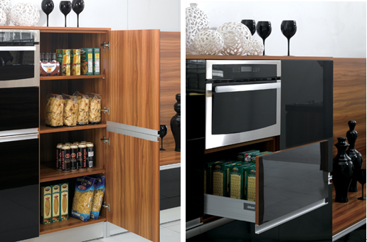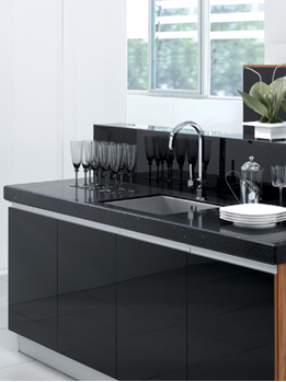 高光镜面的亚克力玻璃门板:高光镜面质地的厨柜门板将是未来厨柜材质的一大走向,它的光泽度和前卫感与大牌时尚想要表达的奢华质感不谋而合。金牌厨柜此次展出的新品香榭丽舍Ⅱ在门板设计中采用木纹门板贴黑色亚克力玻璃,使厨柜的表面具有很强的光泽度和时尚质感,同时78cm加厚的大理石台面又与黑色的亚克力玻璃门板共同营造出一体化的奢华空间。