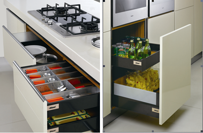 百变星抽屉:源自奥地利的百隆百变星抽屉,使人们在抽帮的色彩选择上更加百变随心、更富个性化。金牌厨柜在西曼Ⅲ中所选用的百隆百变星系列——特拉黑抽棒,与西曼Ⅲ的黛灰色氧化拉手和弧形铝边在色泽上相呼应,完美烘托出香草色门板的柔美气质和宁静气度。