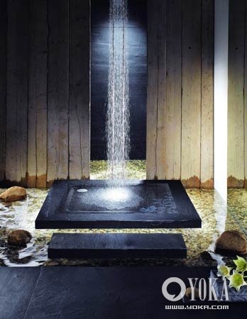 图解:1.沐于流瀑,无限度贴近自然 突破常规的浴室设计,取消了淋浴房常见的玻璃围合,在浴室地面铺上鹅卵石,几块大石随意安置在鹅卵石上,浴室墙面则以本色防腐木为饰。沐浴之时,水流自上而下,仿若流瀑,而黑色装饰百合花图案的超平地面式钢瓷釉淋浴盆,则保证了沐浴时脚部的舒适感。