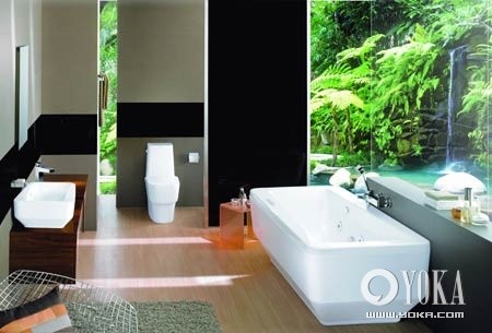 图解:2.“近在咫尺”的山林之趣 把浴室搬进山林听起来有些疯狂,但把“山林野树”迁入浴室,却并非完全不可行。靠浴缸的墙整面贴上数码喷绘的自然风景图片,不出浴室就能体验到自然之趣。现在有些墙纸专卖店能提供此类的定制图案壁纸服务。[NextPage]