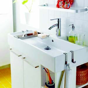 将面盆下方的空间安放储物柜,面盆上部贴墙的位置钉上10厘米宽的搁板,可以放化妆瓶、刷子、洗漱杯等。搁板高度以不妨碍使用水龙头为宜,材料可选用木板、玻璃等。[NextPage]