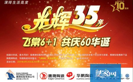 2009年,鹰片卑控股上市10周年,也是中华人民共和国60华诞之际。8月18日,鹰片卑控股迎来了三十五周年的生日。在这特殊的日子,鹰片卑控股以真诚之心感恩回报新老客户,其旗下鹰片卑陶瓷、华鹏陶瓷两大品牌,共同推出主题为“光辉35年——飞常6+1 共庆60华诞”大型促销与路演活动,以全新品牌形象演绎生活高度。