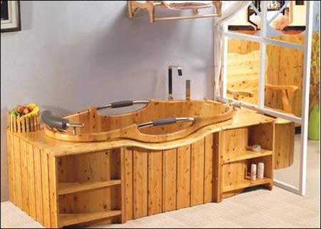 圆形木桶也是今年的流行款式。记者在九牧王卫浴 看到一款圆形木桶,占地不大,摆放和移动都比较方便。这类木桶的价位在2000元以内。而传统的木桶浴缸以元宝形为主,线条流畅,给人简单清爽之感。