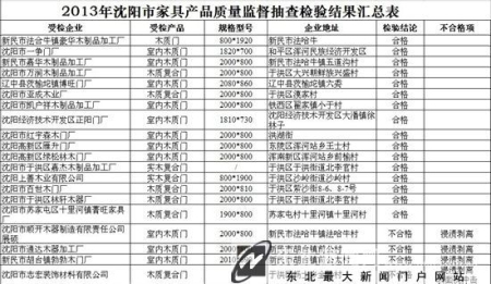 据悉,木制家具产品甲醛释放量超标问题较为严重,个别木家具甲醛释放量甚至超过了30mg/L,超过了国家标准要求的20倍。而在本次抽查的20家室内木质门生产企业生产的20批次产品中,展硕木门(沈阳市顺开木器制造有限责任公司)在抽检中爆出其室内木质门规格型号2000*800,被检测出浸渍剥离不合格。同样被检测出浸渍剥离不合格的还有沈阳市通达木器加工厂、新民市胡台镇勃勃木门厂。同时,沈阳市志宏装饰材料有限公司除了浸渍剥离不合格外,还被检测出表面抗冲击不合格。