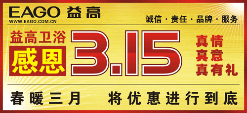 秉承国际品牌严谨细作“精良、精确”品质文化的益高卫浴,在时代进程中创新不止,十多年品质路,见证着中国卫浴业的蓬勃发展。本着答谢全国消费者对益高品牌的厚爱,推行大拇指全程无忧服务理念,保护消费者权益,在3.15来临之际,一场“315益高卫浴将优惠进行到底”大型活动即将在成都、大连、福州、西安、郑州、马鞍山等城市拉开帷幕,在2010年3月6日~2010年3月15日期间浓情上演,以“真情、真意、真有礼,春暖三月中国行”为主要构成,将给消费者带来实实在在的优惠。