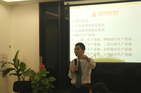 下午的培训以座谈会形式开展。惠万家陶瓷广东大区经理黄友艺首先向经销商们介绍了惠万家品牌发展的相关情况,随后,黄大区对惠万家现有的瓷片、抛光砖、仿古砖、微晶石等产品线分别就生产流程、技术工艺、市场状况等进行了详细的讲解。深入了解惠万家产品后,广东区域经理罗广柱就“如果做好工程服务项目”跟经销商们展开了讨论。罗经理结合详细的工程介绍ppt分享道:“做好工程服务关键要对全过程做好跟踪,不容忽略任何一个细节,并且要合理利用好集团公司的资源,这样一定会有大突破。”最后,在场的经销商们及时提出一些的疑问,借此机会向厂家总部吸取更多做好工程服务的经验。整个培训持续了2个半小时。黄大区表示:“深圳龙华经销商们主动到厂家了解情况的好学精神感动了我们,厂商这种高密度的沟通联合一定会取得好的成效。”