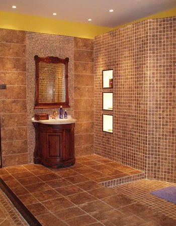 仿造天然石材感觉的瓷砖表面大多粗糙不平,作为浴室的地砖可以增大摩擦力,不易滑倒,也可以 用作墙面造型和背景墙装饰。