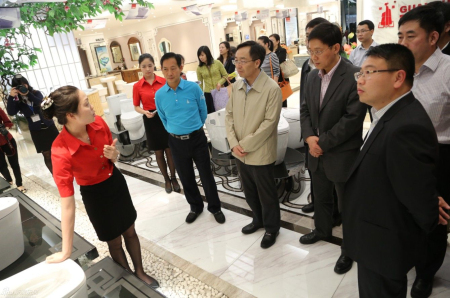 在卫浴智能座便器展区,叶德林董事长介绍说:“这是我们的最新的全自动智能座便器,将传统的洁具与妇洗器功能结合在一起,高度智能、感应灵敏,更舒适、更洁净、更人性化。”黄主席听后很有感触:“新明珠陶瓷的产品已达到国际先进、行业领先的水平,新明珠产品的创新力令人耳目一新。真是与时俱进,很不错。”