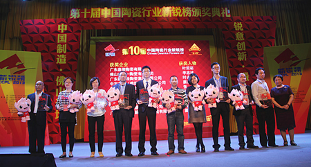 3月28日,由中国陶瓷工业协会、陶城报联合主办的第十届中国陶瓷行业新锐榜(以下简称新锐榜)颁奖典礼在佛山新媒体产业园隆重举行,来自政府、陶瓷行业协会领导、各大陶瓷企业精英代表及媒体朋友等共400多人出席了此次盛典。金丝玉玛作为行业佼佼者,在本年度新锐榜中众望所归,席卷多项大奖。其中金丝玉玛微晶石“旷世彩晶”系列荣获“年度优秀产品”、“终端特攻组”荣获“年度商业案例”、沈阳金丝玉玛至尊店荣获“年度优秀专卖店”,而金丝玉玛企业董事长章云树则当选“年度人物”。一次囊括多项重量级大奖,这是继第九届新锐榜后,金丝玉玛再次成为颁奖舞台上的大赢家。