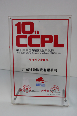 2014年3月28日下午两点,由中国陶瓷工业协会和陶城报社主办的第十届中国陶瓷行业新锐榜颁奖盛典于佛山新媒体产业园隆重举行。特地陶瓷喜获“特别贡献奖”及“年度社会责任奖”两大奖项。特地董事长冯红健先生受邀做客嘉宾论坛,与行业领袖共话中国陶瓷行业新形势。