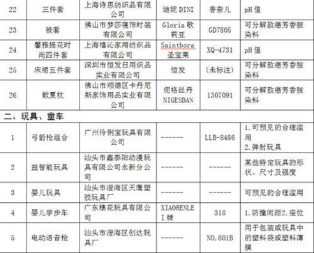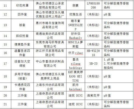 广东省工商局消费者权益保护处处长陈业怀介绍,在本次公布的缺陷商品名单中,有26款商品类属床上用品,商品中存在的缺陷为染料可分解致癌芳香胺、纺织品pH值不符合标准。