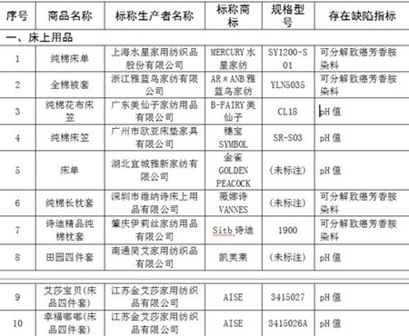 如上海水星家用纺织品股份有限公司生产的型号为SY1200-S01的纯棉床单,被检测出染料可分解致癌芳香胺,广东美仙子家纺用品有限公司生产的型号为CL18的纯棉花布床笠被发现pH值不符合标准。