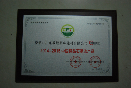 据了解,此次活动是由国际建筑装饰室内设计协会以及中国国际环境艺术行业协会联合主办,由专家评选团从产品创新、市场影响力等方面进行综合考量,最终选出“2014—2015中国微晶石潮流产品”、“2014—2015设计师推荐潮流产品”两项荣誉的获奖企业。最终,敦煌明珠从众多参评企业中脱颖而出,凭借着优秀的产品获得了这两个奖项。