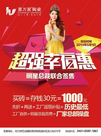 惠万家陶瓷“超强幸福惠”明星签售会5月1日送惠到哈尔滨啦!为感恩哈尔滨广大消费者对惠万家陶瓷的支持与信赖,惠万家陶瓷与亲善大使王玉瑶携手5.1举行明星签售活动倾情大让利。从2014年4月10日起哈尔滨惠万家门店即可接受购砖预定,下定满1000元送价值398元品牌电饭煲。明星到场签售低价享到底,4月10日至4月30日前买签售卡30元送价值68元的精美小推车,5月1日上午10:00明星总裁签售后30元预约金最高可抵1000元抵充货款。且厂家总裁携多款明星爆品厂价直供,限量供应,超值低价只有你想不到的,抢不到就哭了!活动当天更可享受100%幸运抽奖,送名牌家电电视机、空调、微波炉,还等?赶快亲临哈尔滨惠万家陶瓷专门店咨询下定吧!