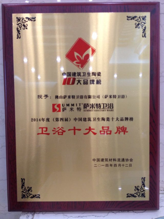 承万千期待,载品牌价值!由中国陶瓷网、中国建筑材料流通协会共同举办第四届中国房地产与泛家居行业跨界峰会暨“2014年度中国建筑卫生陶瓷十大品牌榜颁奖典礼”于2014年4月12日在北京•人民大会堂隆重举办。新明珠集团旗下品牌喜获6大项奖项,其中冠珠陶瓷喜获“陶瓷十大品牌”称号,萨米特陶瓷同时喜获“抛光砖十大品牌”和“瓷片十大品牌”两大称号,萨米特卫浴喜获“卫浴十大品牌” 称号,惠万家陶瓷和金朝阳陶瓷喜获“瓷片十大品牌” 称号。