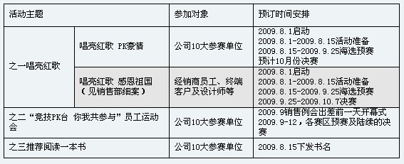 各赛区负责人进行沟通协调,公司网站挂链接广告,东鹏风采报做预告,下发具体的执行方案及细则。各赛区阅读细则并结合本身工作进度安排对应的活动。 |