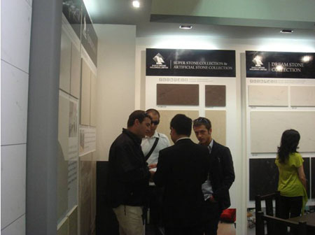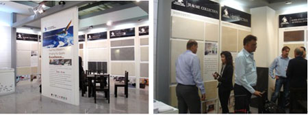 鹰片卑陶瓷在今年加大了新产品开发力度,全新问世的抛光砖新产品日全石、梦幻石、欧尚?巴洛克风、皇家莎安娜等,仿古砖新品流金溢彩(釉下彩)、撒哈拉、细沙长流、千层岩、浪淘沙等以及真石韵石纹瓷片等一系列新产品切合今年Cersaie展的瓷砖发展方向,市场反应十分热烈,吸引了欧洲、非洲、美洲、东南亚等世界各地采购商的眼球,前来洽谈业务的国外客商络绎不绝。