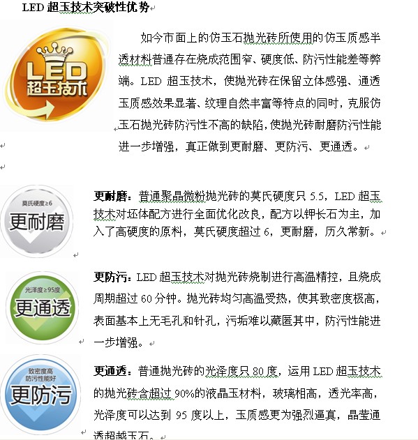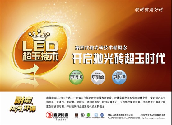 2009年,鹰片卑陶瓷LED超玉技术面世,拉开了抛光砖发展新篇章,开创第四代抛光砖技术新概念。抛光砖将告别仿石与仿玉时代,在LED超玉技术的带领下走进超玉时代。