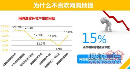 搜狐焦点家居发布的2014地板消费渠道调查报告中,有数据显示,网购地板的消费者最终对售前、售中(物流)、售后的满意度分别只有23%、15%、10%。如何提升网购的满意度,已经成为地板电商的当务之急。