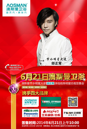 据悉,6月21日,澳斯曼卫浴将携手建材行业诺贝尔瓷砖、雷士照明、北美枫情地板、法狮龙时尚吊顶四大品牌,在海南海口万佳家居装饰广场举办大型总裁签售会,当然,活动少不了澳斯曼卫浴节水明星大使邰正宵的亲临助阵,海南人们有福啦!