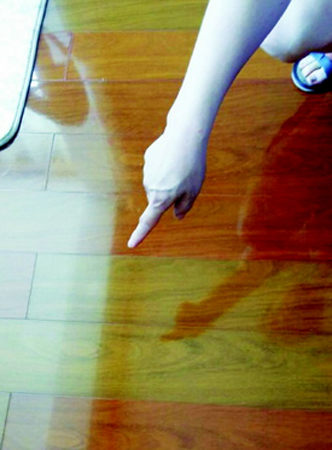 林先生指着地板说,深色地板是地板本来的颜色,浅色的是变色的地板,反差非常明显
