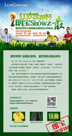 无论你是还在32强中寻找“中国队”身影的“魏秋蜜”(伪球迷),还是已经对上榜大单球星了如指掌的“董秋迪”(懂球帝),估计你只想说:“OH!OH!OH!~熬夜的‘幸福’日子又来了!” 但是,现在的你还是象以往一样独守电视机前为你喜欢的球队呐喊助威吗?你还是在深夜害怕邻居的责骂而按下“静音键”不敢尖叫呢?你是否拿着啤酒罐找空气碰杯,然后大叫一声“XXX,OH YEAH”呢?噢不,这些不是我要的,我需要怒吼,需要欢呼,需要有人GIVE MI FIVE.既然如此,那就赶紧添加朗宝官方微信吧,SHOW TIME等你来,只要你认为自己够格称为一个“球迷”就来挑战吧。