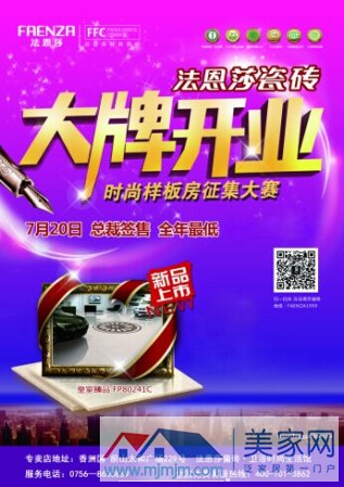 2014年7月20日,珠海法恩莎瓷砖时尚生活馆将正式落户,大牌开业,总裁亲临,吃喝玩乐、折扣免单,应有尽有!如果你是个“吃货”、如果你爱玩、如果你想“捡便宜”,珠海法恩莎让你“根本停不下来”!!!