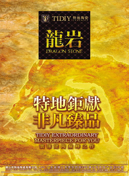 2010年初,特地陶瓷以“特地行.新见未来”为主题,“创新”为关键字拉开了年度发展的序幕,随着全新打造展厅的揭幕,有幸参与了发布仪式的业内人士惊喜地一睹这款传说中的新产品---特地“龙岩”,其惊艳亮相使得人们惊呼“这是仿石材砖的重新定义,无论从技术上,还是材质表现力上都代表了行业巅峰水平”!