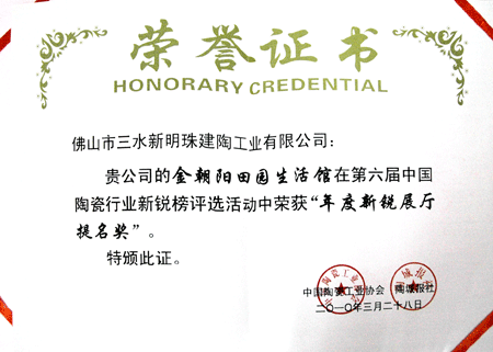 2010年3月28日,由中国陶瓷工业协会和陶城报社主办的“第六届中国陶瓷行业新锐榜颁奖典礼”佛山市东平新城佛山电视台一号演播大厅隆重举行。金朝阳陶瓷田园生活馆荣获新锐展厅提名奖。