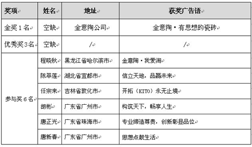 2009年8月15日,广东金意陶陶瓷有限公司向全国发出KITO品牌广告语及产品应用方案征集令。截至2009年12月31日为止,共收到全国各地,包括港澳台地区发来的广告语共3099条,投稿人数达到547人。本着公开、公平、公正的原则,KITO品牌广告语评选小组于2010年2月26日对所有的作品进行反复、严格的评审。最后一致确定“金意陶•有思想的瓷砖”作为广东金意陶陶瓷有限公司的最新品牌广告语,现将获奖情况公布如下:(排名不分先后)