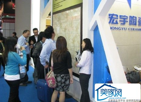 从现场可以看到,宏宇展位紧靠A馆B区9.2号建材展区入口处,精心展示了抛光砖、仿古砖、釉面砖、广场砖等系列精品,前往参观洽商的海外客户一波又一波,其中宏宇陶瓷采用首创的“高清三维印刷技术”制造的“石雕”釉面砖风头甚足,俨然成了“明星”。