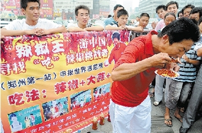 “辣椒王,游中国,寻找吃辣椒挑战者,冲刺世界吉尼斯。”昨日(7月28日),本报(郑州晚报)曾报道过的“河南辣椒王”李永志开始了自己吃辣椒挑战天下的第一站——在郑州火车站摆擂4天,接受挑战。随后,他还要到长沙、昆明、成都、合肥等地寻找挑战者,直到自己被打败为止。