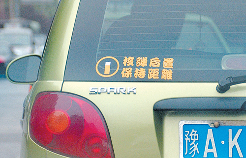 如今是个个性的年代,大家都喜欢在一些比较庄重的标语中间增加一些调侃的成分,娱乐自己也娱乐他人。昨日下午,在陇海路与大学路交叉口,一辆等红灯的乐驰轿车后车窗上的一条个性标语吸引了不少人的注意,“核弹后置 保持距离”。如此雷人的标语,把后面的司机“吓了一跳”。