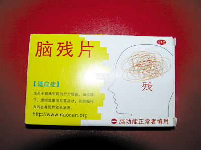 包装正面印有大大的“脑残片”字样,而旁边是一个人脑图样,脑中印有“残”字。