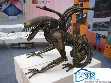 潮流街展示区里,纸扑工艺龙狮、环境艺术雕塑等各种设计意念超前、动感新颖的创意作品,引来了现场观众的驻足观看。其中,尤以把环保、艺术、空间三大范畴有机结合、运用废旧金属拼凑焊接而成的栩栩如生的工艺作品“硬刃”,成为了全场瞩目的焦点。