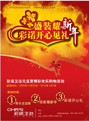 随着2010的脚步悄悄走近,彩诺卫浴为辞旧迎新,传播彩诺手绘艺术文化,特举办主题为“盛装耀新年,彩诺开心见礼”—— 彩诺卫浴元旦更精彩欢乐购物活动。活动内容丰富多彩,处处温情洋溢,是寒冬中难得一见的七彩礼花,祝愿每一位顾客都能在新的一年美好生活如彩诺般“出众,自然出彩”! 更多精彩优惠请到各彩诺卫浴专卖店内查询。