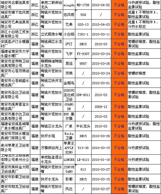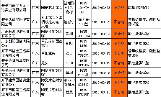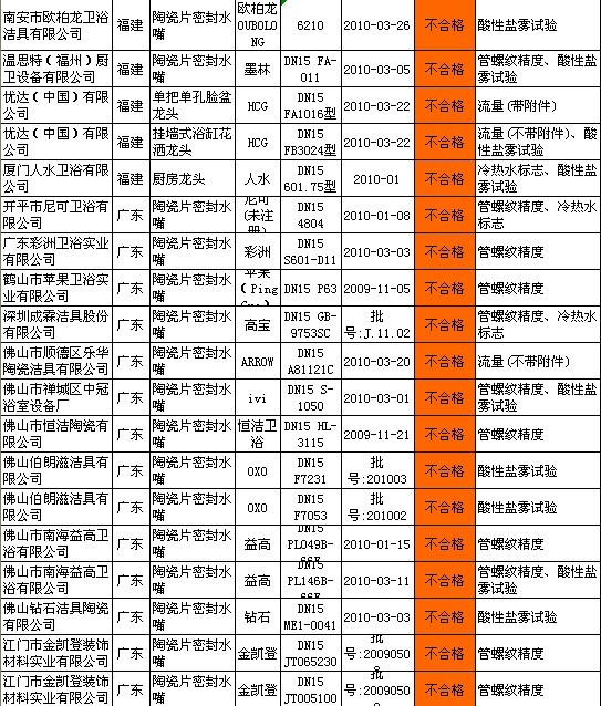 检验结果显示,有76家企业的83种产品不符合标准要求,其中59批次酸性盐雾试验项目不合格。据了解,盐雾试验主要是检测水嘴在24小时乙酸盐雾环境下,镀铬表层被腐蚀情况的指标。32批次产品管螺纹精度不合格,该项目主要检测螺纹精度质量,保证与供水管路的正常安装连接。此外,还有部分产品流量(带附件)、冷热疲劳试验、冷热水标志等项目不合格。