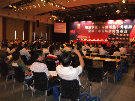 由佛山可诺陶瓷和台湾鉦翰陶瓷,两岸同胞经过多年刻苦钻研,终于在全世界率先发出轻质(可漂在水面上)节能(保温、隔热效果好)外墙砖,于2009年10月13日上午10:00在佛山瓷海国际五楼国际会议厅召开“佛山可诺陶瓷陶瓷、台湾鉦翰陶瓷:轻质节能(保温隔热)外墙砖全球首场新闻发布会”。本次新闻发布会由佛山可诺陶瓷科技有限公司主办,佛山市无极文化传播有限公司承办。中国建筑装饰协会幕墙工程委员会秘书长宋协昌、广东陶瓷协会常务副会长陈环与秘书长陈振广、中国陶瓷艺术大师钟汝荣、佛山市相关部门领导、工商界人士、媒体记者共计200余人出席,共同见证这一陶业革命性盛会。