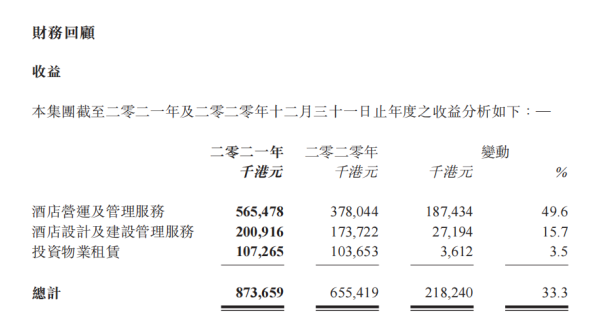 万达酒店2021年收入8.73亿港元,同比增33%;毛利4.61亿港元,毛利率下降至52.9%;归属股东净利润2.4亿港元,同比增45.65%。就公司营收而言,主要来自三大业务——酒店营运及管理服务、酒店设计及建设管理服务、投资物业租赁,均同比提升;其中酒店营运及管理服务收入增幅高达49.6%。
