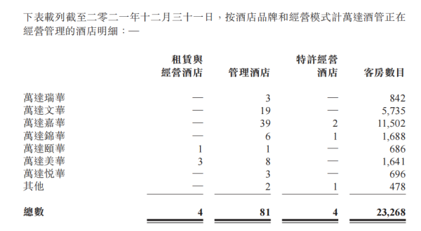 作为一家轻资产酒店管理公司,万达酒店主要业务包括酒店运营与管理服务、酒店设计与建设管理服务以及投资物业租赁,其中酒店管理服务是公司主营业务。旗下酒店品牌包括万达瑞华酒店、万达文华酒店、万达嘉华酒店、万达锦华酒店、万达颐华酒店、万达美华酒店和万达悦华酒店。截至2021年12月31日,公司管理包括89家酒店,运营客房23268间,覆盖中国74个城市和土耳其的伊斯坦布尔;已签约管理正在开发中尚未开业的酒店有171家。