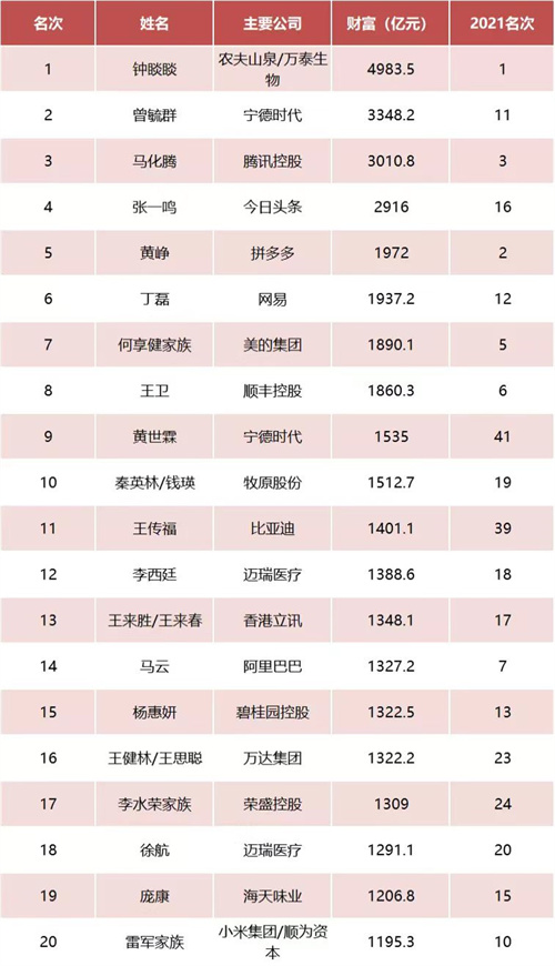 很多事物都是缓慢变化的,市场有周期,行业有周期。日前,新财富500富人榜正式发布,农夫山泉钟睒睒以4983.5亿元财富成功连任首富,宁德时代曾毓群、黄世霖,以及牧原股份的秦英林和钱瑛夫妇首度进入榜单前十;备受关注的互联网巨富里,马化腾依然排名第三,39岁的张一鸣财富激增1200亿元,晋升第四名。