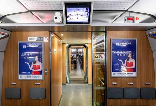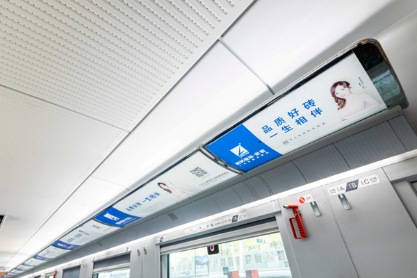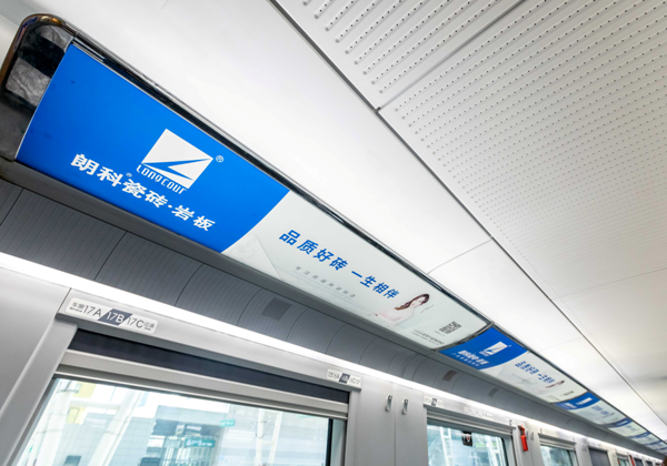 乘客上车前第一眼就聚焦到大气恢弘的外车身贴,上车之后让乘客无论坐、立、行、视、听,均能感受到朗科瓷砖•岩板的品牌形象。车厢内头巾、小桌板、车厢海报和行李架处张贴了精美的宣传画,在列车LED显示屏上循环播放宣传滚动字幕,将“品质好砖•一生相伴”的品牌理念以高铁的速度向外传播,让更多旅客全方位了解、熟知、体验朗科瓷砖•岩板的品牌魅力。
