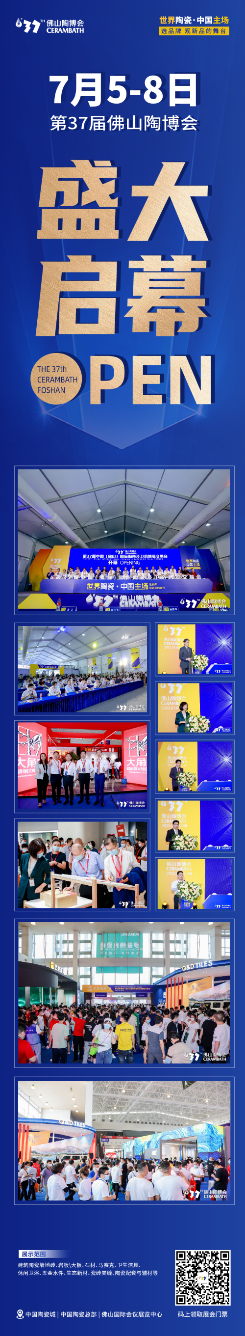 7月5日上午,第37届中国(佛山)国际陶瓷及卫浴博览交易会(以下简称“佛山陶博会”)在广东佛山国际会议展览中心展馆盛大开幕!来自西班牙、柬埔寨驻华领馆商会嘉宾,佛山市各级政府代表、全国及各地方产区行业协会代表、参展商、经销商、设计师以及新闻媒体等近300人莅临现场,共同见证第37届佛山陶博会拉开序幕!